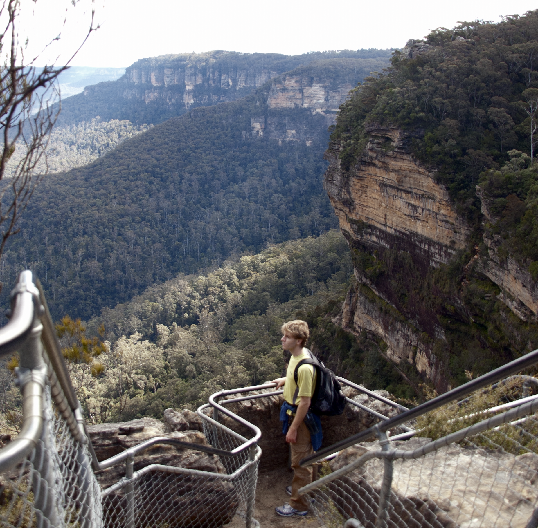 As we got into the Wentworth Falls area, the vegetation started to become more lush, the ground more damp, the humidity increased, and the waterfalls increased in size. And then we got to a lookout. Oh boy, was it stunning. I was frozen in place, staring out over an enormous valley, on top of a ~300 foot cliff. The valley is flanked by vibrantly colored sandstone walls, and headed by a giant waterfall, Wentworth Falls. We continued walking a path that took us along one of the walls of the valley, and every time I looked out over it, I was awestruck. The place is beautiful.