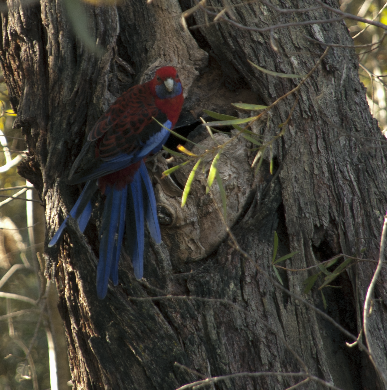 A crimson rosella sits near a hole in a tree.