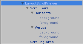 LayoutScrollViewer HierarchyThe Scroll Viewer requires some extra setup. Since it has scroll bars, the sprites for the scrollbar background and thumb need to be setup. Under the “Scroll Bars” child of the LayoutScrollViewer Prefab are the two scrollbars. Each of these has two children, one for the background and one for the thumb (foreground). These are just NGUI Sprites and use an NGUI Atlas.